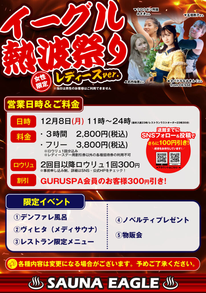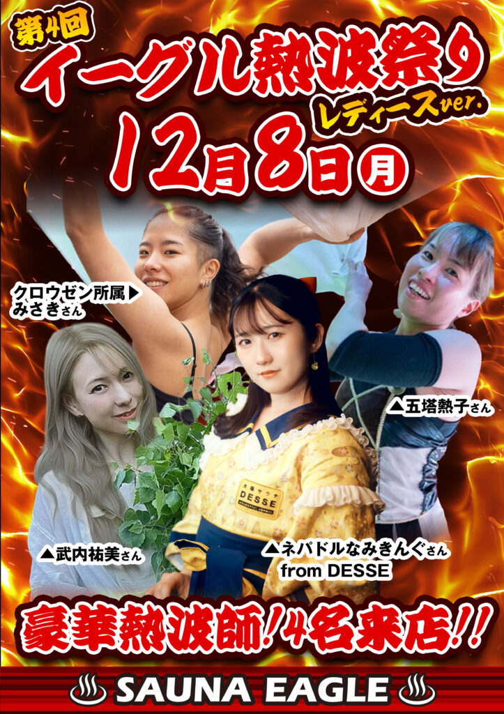 当日は「イーグル熱波祭レディースver.」と題し、女性熱波師界のトップランナー4名をお迎えしての豪華ロウリュ(アウフグース)をはじめ、女性向けの特別イベントを多数ご用意しております。普段は入ることのできない本格派男性専用サウナを、この貴重な機会にぜひご体感ください。