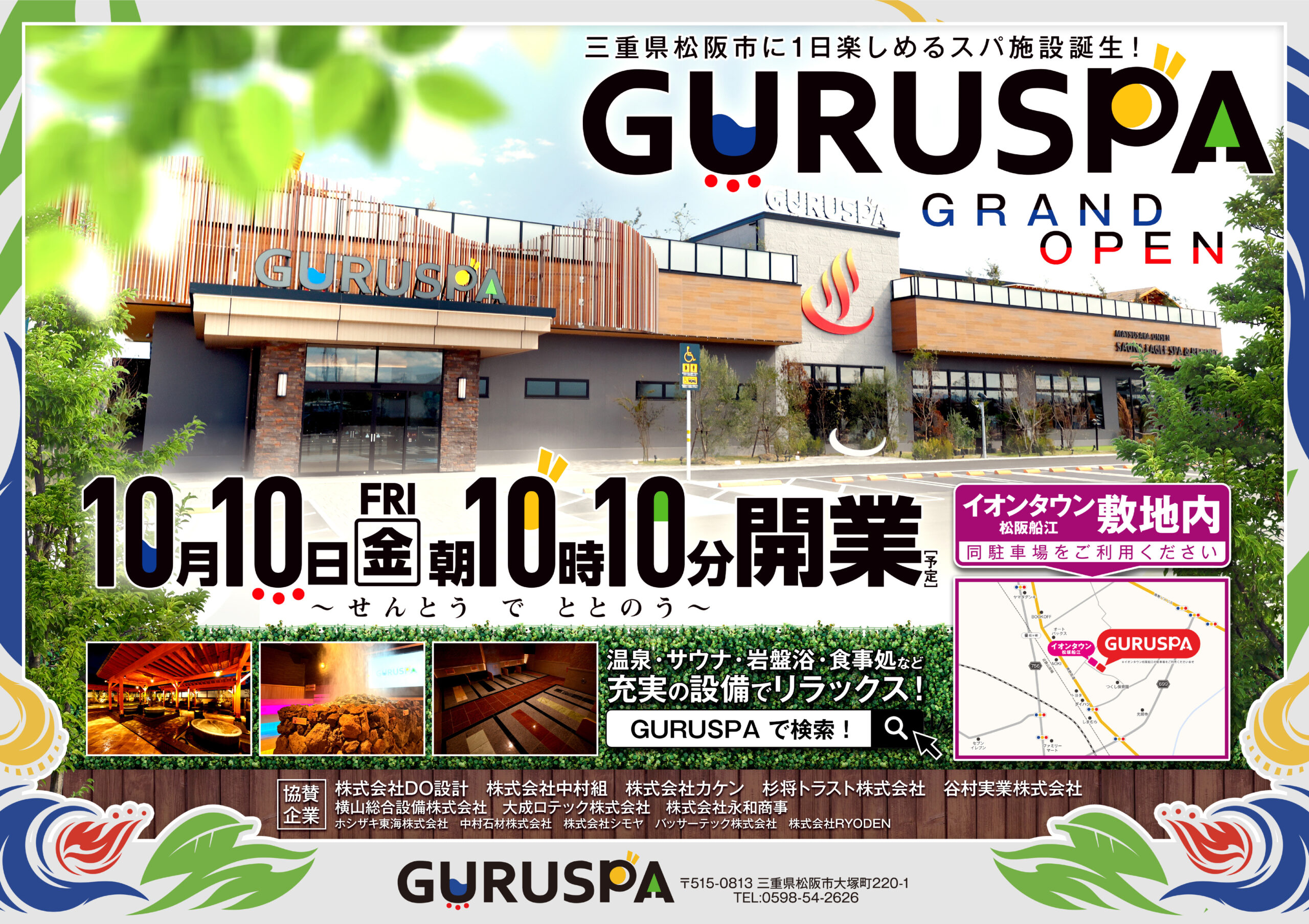 2025.10.08 お知らせ 【松阪温泉GURUSPA】プレオープンを実施いたしました 10/3(金)、サウナイーグルの姉妹店となる、松阪温泉GURUSPAのプレオープンを実施いたしました。 抽選にご当選された松阪市民のお客様をはじめ、ご利用いただけました皆様ありがとうございました。 頂いたご意見ご要望をもとにさらにサービスの向上に努め、グランドオープンにはよりご満足いただける施設を目指してまいります。 サウナイーグルのお客様も、是非足を運んでいただけますと幸いです。 グランドオープンは2025年10月10日の10時10分となります。 今しばらくお待ちくださいませ。 一覧に戻る