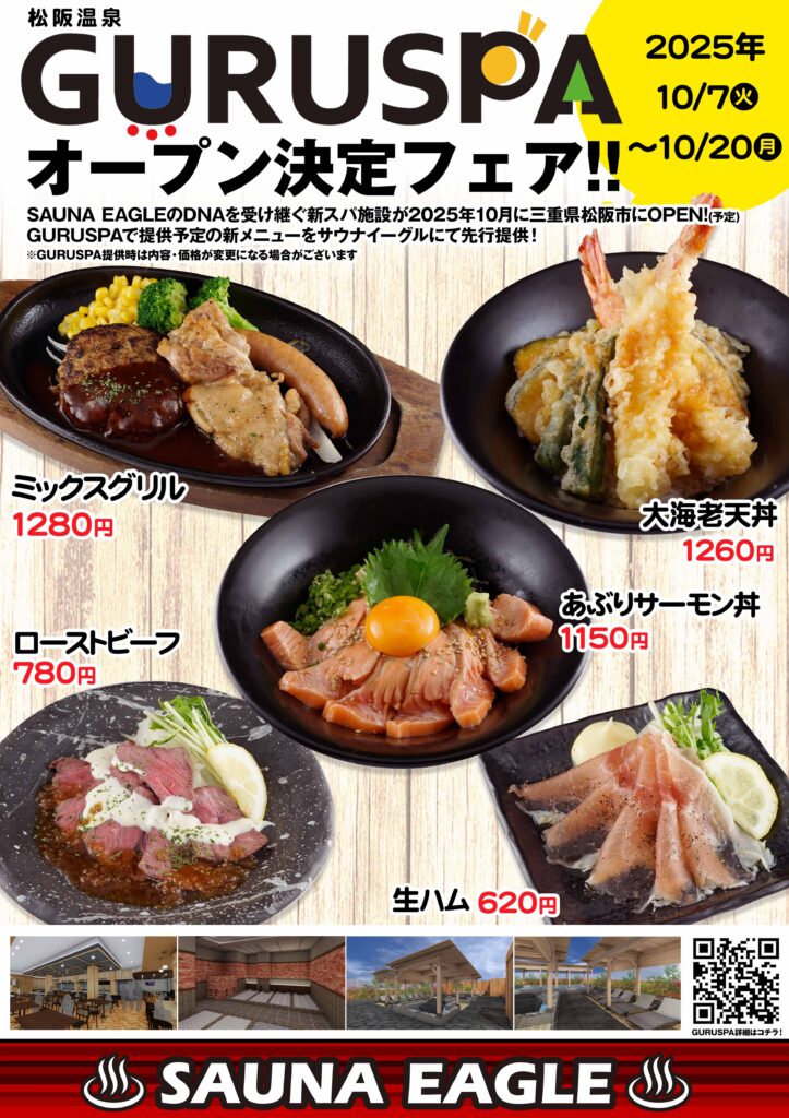 その記念として、サウナイーグルではGURUSPAで提供予定の特別メニューを一部先行でお楽しみいただけるフェアを開催いたします。
