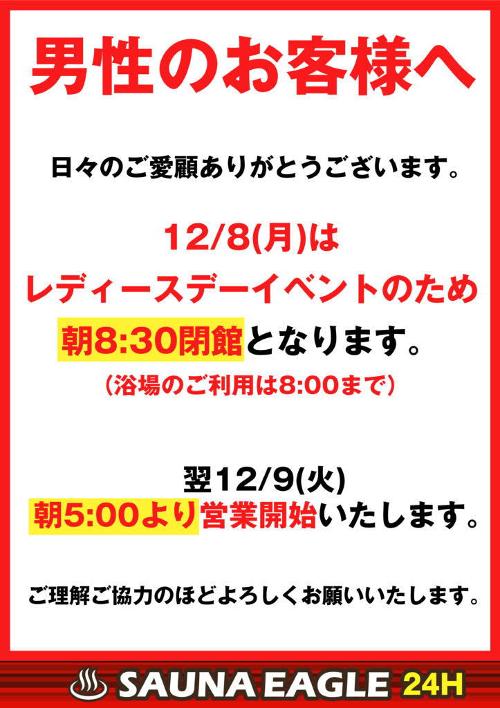12/8(月)はレディースデーの為、朝8時30分に閉館となります。
