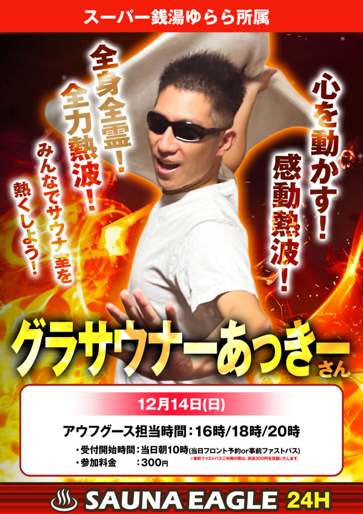12/7(日) スーパー銭湯ゆらら所属の熱波師 【グラサウナーあっきーさんご来店!!】