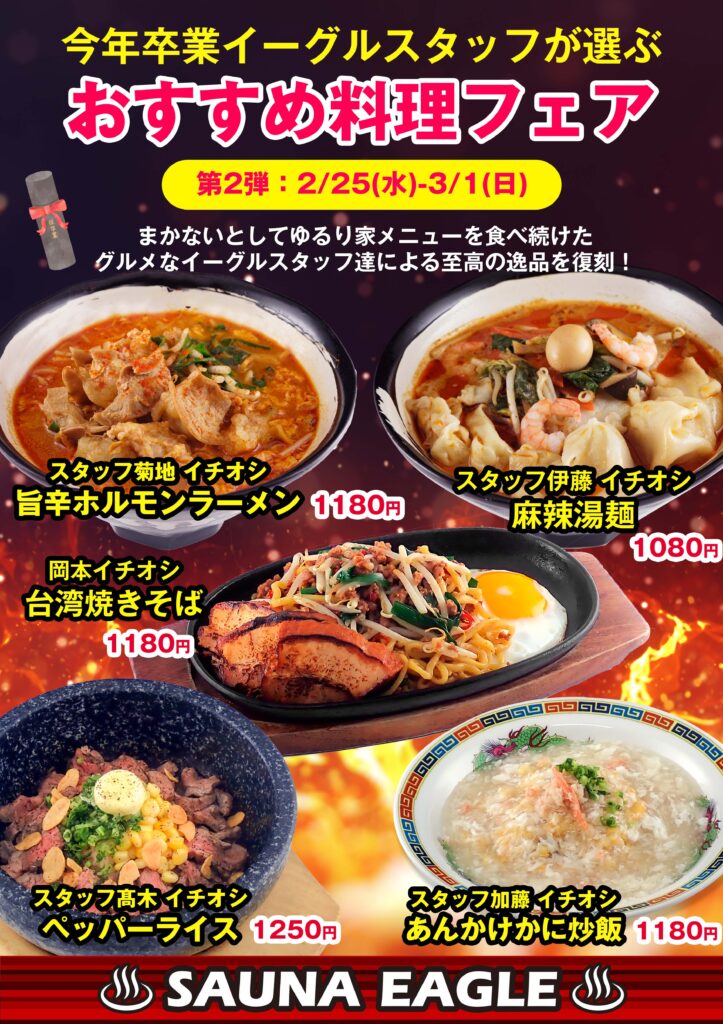 2/25~3/1 卒業生が選ぶおすすめ料理フェア第2弾 公開日: 2026年02月26日 まかないとして様々なメニューを食べ尽し、作って来たスタッフが選ぶ限定の一品。 通常メニューにはない5日間限定メニューです! ※岡本2022年10月入社/加藤2025年2月入社/高木2024年9月入社/伊藤2023年8月入社/菊地2024年4月入社 一覧に戻る